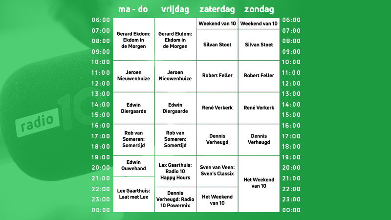 Roland Snoeijer, radio director van de radiozender: “De programmering van Radio 10 staat als een huis. We hebben een sterk en gevarieerd team, waarmee we luisteraars nog beter kunnen entertainen. We kijken enorm uit naar de start van de nieuwe programma’s en naar gave luisteraarsacties als ‘De Lach van 10’ en de ‘Week van de 90’s Hits’.”