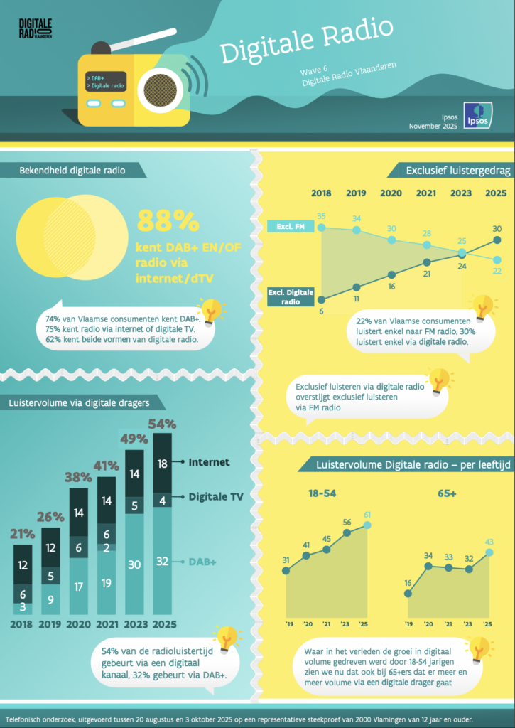 In 2025 gebeurt inmiddels meer dan de helft (54%) van het luistervolume via digitale kanalen (DAB+, internet of digitale tv). Dat is een stijging ten opzichte van 2023, toen dat aandeel nog 49% bedroeg. Bovendien luistert vandaag 30% van de Vlamingen uitsluitend digitaal, tegenover 24% twee jaar geleden. Daarmee zijn er ook voor het eerst meer Vlamingen die enkel digitaal luisteren dan mensen die enkel via FM luisteren.